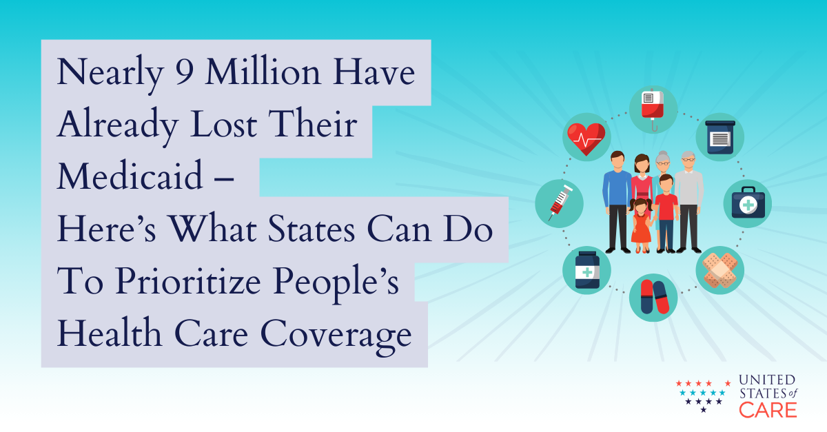 An image with the post’s title, “Nearly 9 Million Have Already Lost Their Medicaid — Here’s What States Can Do To Prioritize People’s Health Care Coverage” accompanied by a graphic of a 6-person family with images of health care (a pill bottle, bandaids, a heart, a syringe, a briefcase, and an IV administration set) circling around them.