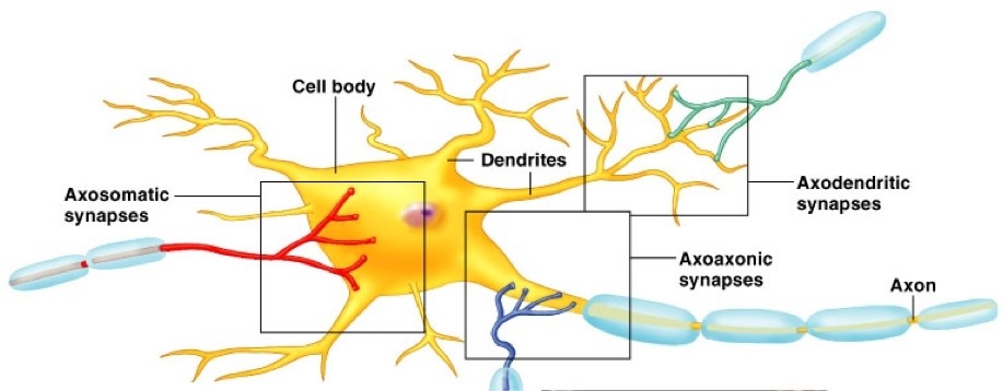 A neuron, as you can see, is comprised of a cell body, tentacle-like dendrites, and synapses. The cell body contains the nucleus of the neuron cell. The dendrites are responsible for connecting to other neurons. The synapses, which we will go more in-depth on in a minute, are how the neurons communicate. But before we go into that step, I want to point out the two main types of synapses. There are axondendritic synapses, which is when a neuron connects to the dendrites of a different neuron. There are also axosomatic synapses, where the axon of a neuron attaches directly to the neuron body itself (called a soma). Being the most direct, the latter is more powerful of a signal. Other types of connections include axoaxonic – connection between two axons, dendrodendritic – connection between two dendrites, and dendrosomatic – connection between dendrites and somas. These are important to understand as it demonstrates the massive connectivity, and large interwoven network, the nervous system has created. (Take notice of the axosomatic, axoaxonic, and axodendritic synapses in the above photo).