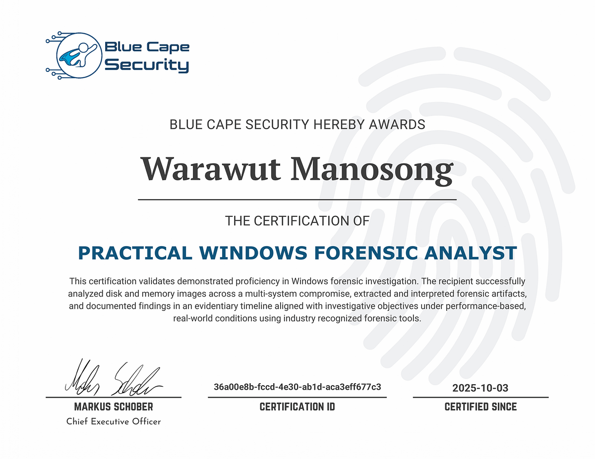 Hello everyone, It’s me Chicken0248 with the first ever forensics certification exam from Blue Cape Security which is Practical Windows Forensic Analyst (PWFA). this exam was announced in August 2025, and the exam format is very unique, but it required you to utilize your Windows Forensics methodologies to the fullest to be able to pass it.