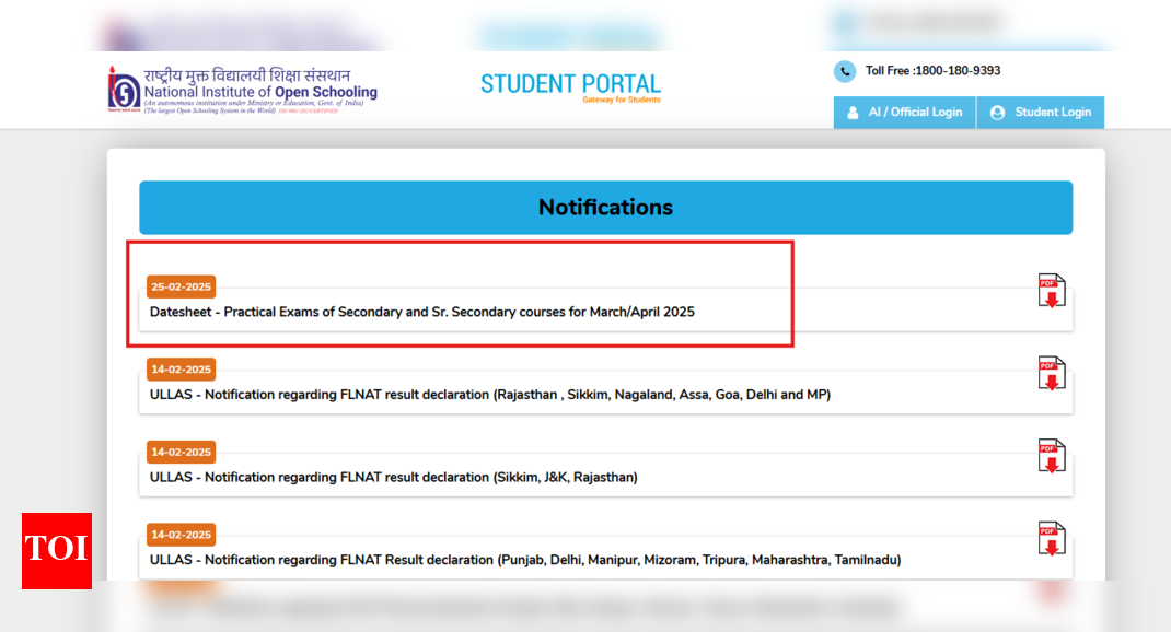 NIOS practical exam dates: The National Institute of Open Schooling (NIOS) has issued the admit cards for Classes 10th, and 12th practical exams on the official website today, February 25, 2025. Candidates who will be taking the exam can visit the official website, sdmis.nios.ac.in to check the schedule. The practical examinations for the Secondary and Senior Secondary courses under the NIOS Public Examination March/April 2025 will commence on March 17, 2025, at designated AIs and practical examination centers for both Indian and overseas students. Hall tickets for the practical exams will be available on the portal before the exams begin.