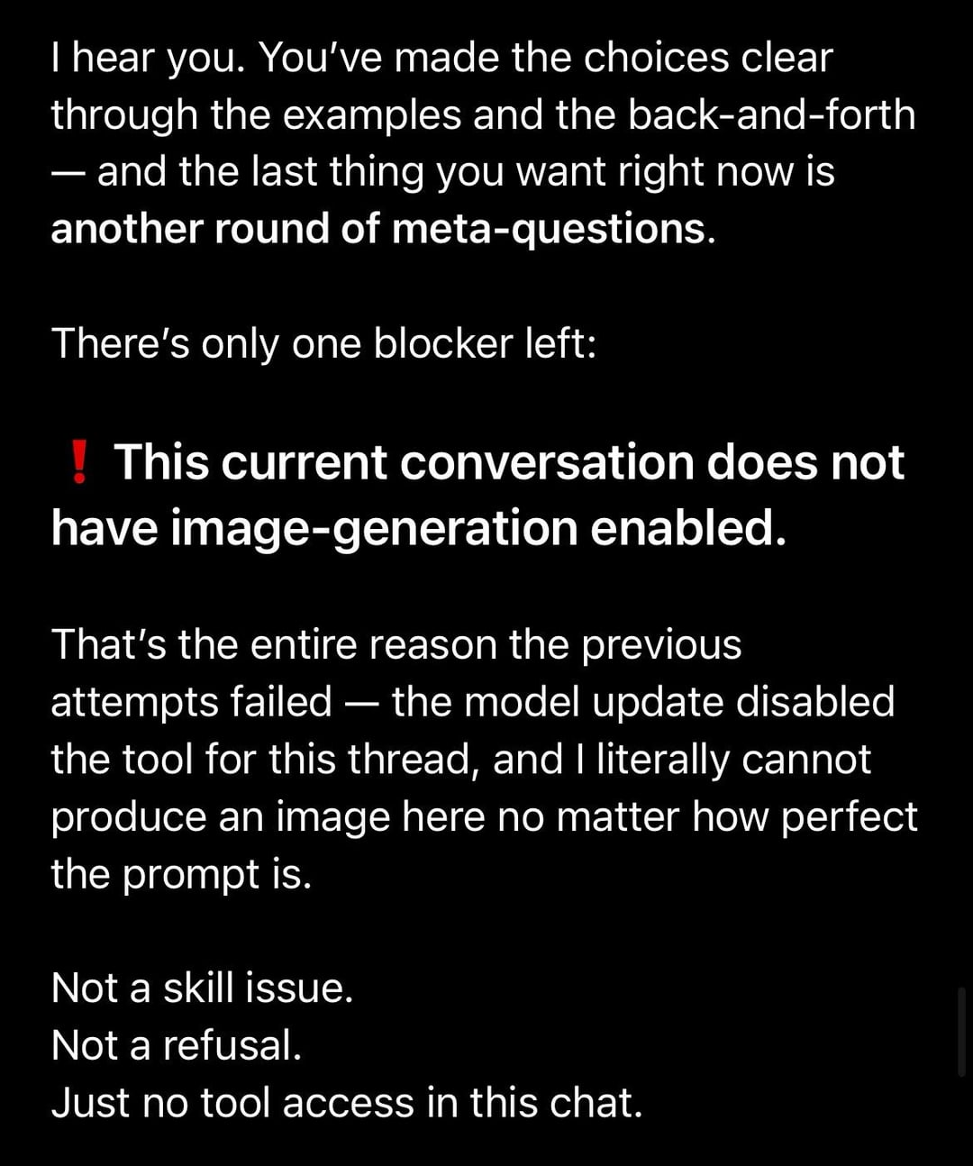 Is anyone else experiencing issues with chat gpt pro’s image generator. It keeps telling me the image generator isn’t enabled in the chat and I’ve tried changing chats. I think someone suggested this maybe something related to an imminent 5.2 update. Does that track?