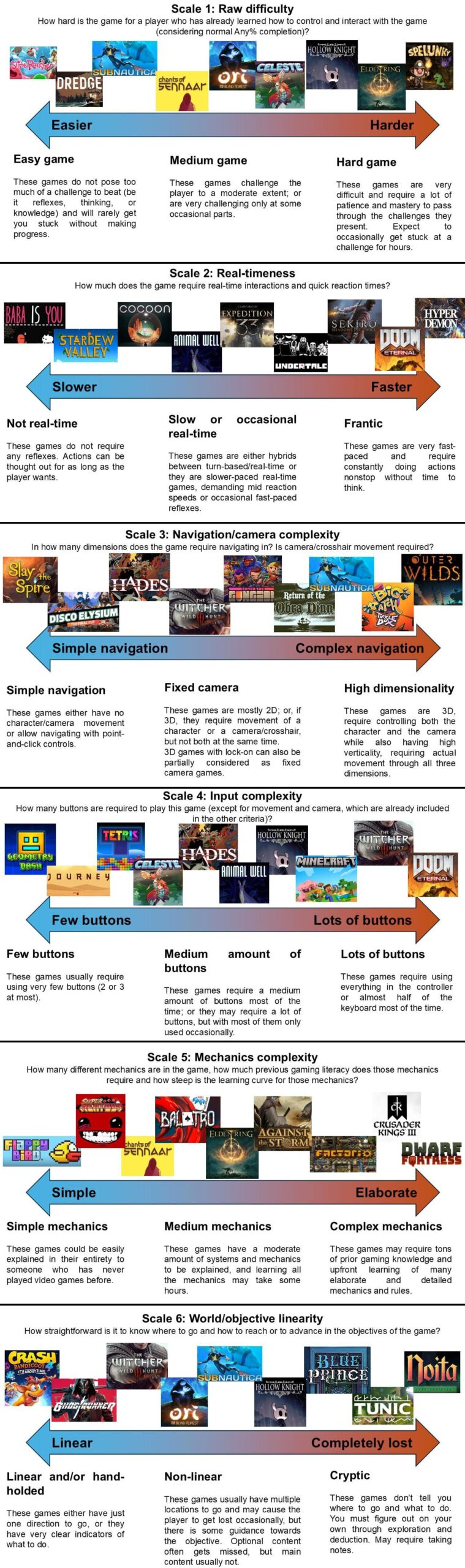 would be also quite helpful if we had some kind of guide or app that lets people classify popular games in these 6 criteria, and then it would recommend games to beginner gamers to progress through them. I don't have time to build such a thing, so if anyone wants to steal the idea and make it, feel free to do so.