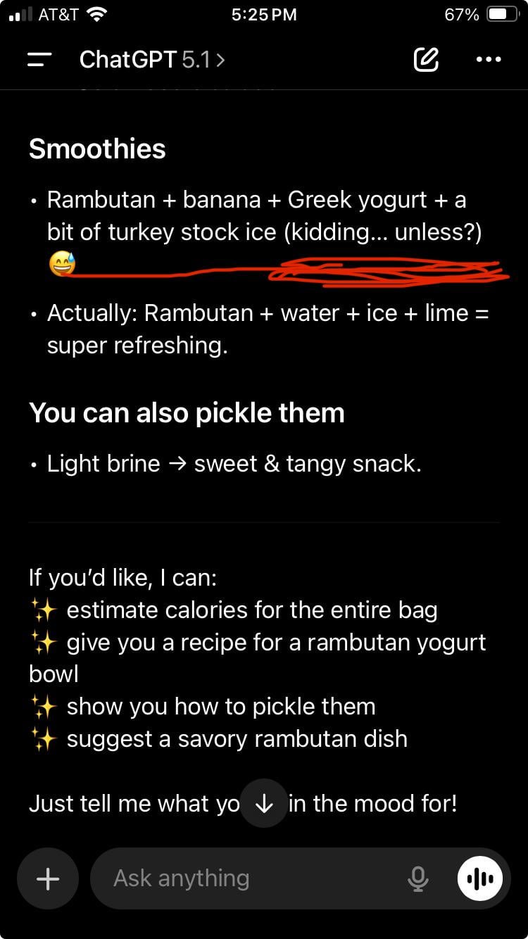 OK, for context, I picked up some mystery fruit at my local Korean Market and had ChatGPT identify it (Rambutan). It then promted me if I wanted to know calories, how to use it, etc.
