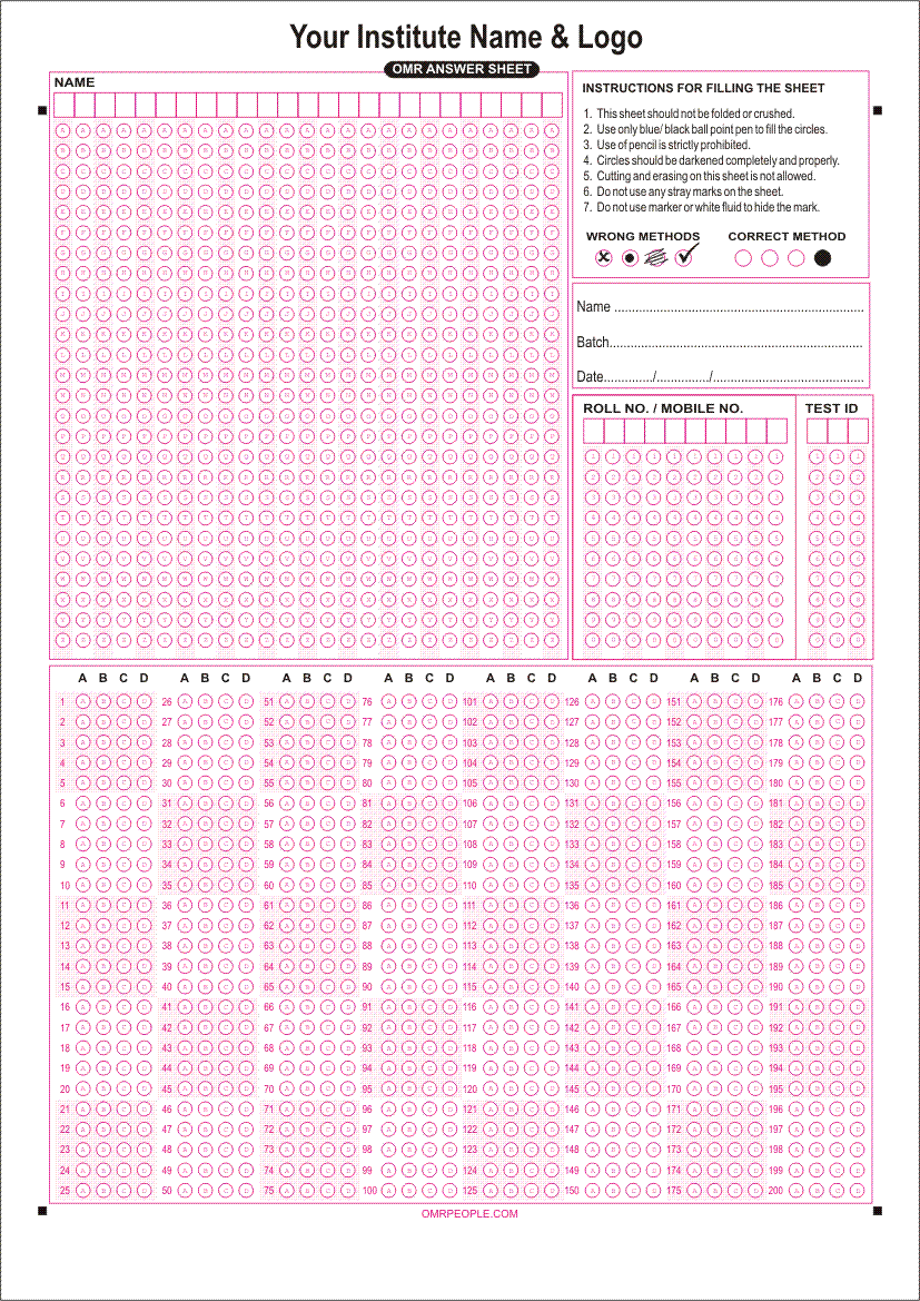 There are 3 Sheet options of 200, 100 and 50 questions available in OMR mini with name block in OMR format and there are three simple OMR sheets which have only the Roll no. block without name block.