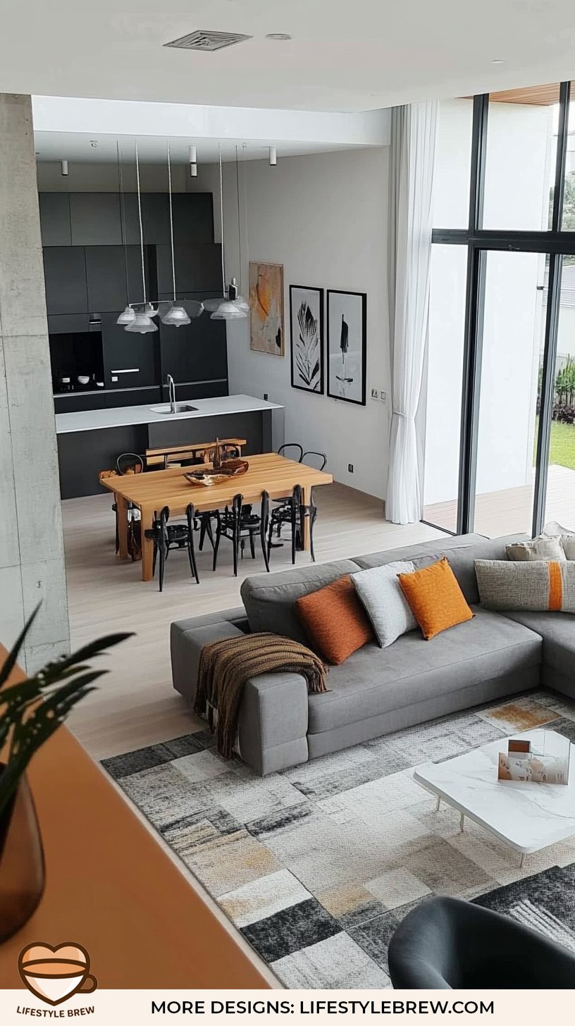 Mid-century modern design is perfect for open-plan layouts, as it blends retro aesthetics with contemporary functionality. Think tapered furniture legs, bold colors, and geometric patterns. To keep the space feeling cohesive, opt for a statement sofa in a bold color like mustard yellow or teal, and pair it with wooden accents. Complement the look with eye-catching lighting fixtures such as a Sputnik chandelier or sleek floor lamps.