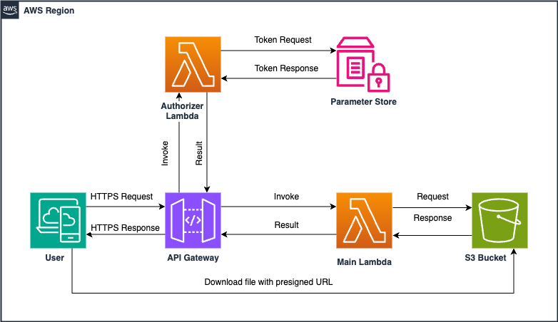 In this project, we build a serverless architecture that allows users to securely download files from an S3 bucket via an API Gateway endpoint. API Gateway is secured using a Lambda Authorizer to ensure only authorized requests are processed. The architecture also incorporates OpenTelemetry tracing, providing detailed visibility into each request’s lifecycle — from API Gateway to Lambda functions and interactions with the S3 bucket. All resources (except the parameter in the Parameter Store) were created with CloudFormation.