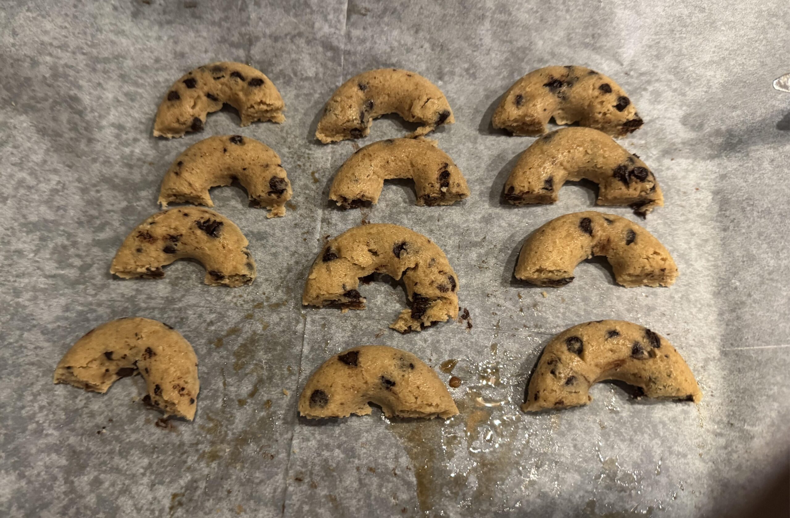 After some experimentation I was able to make them into a distinct ear-like shape. Chocolate chip cookies don’t shape well like sugar cookies do. I used a silicon donut mold and cut them in half.