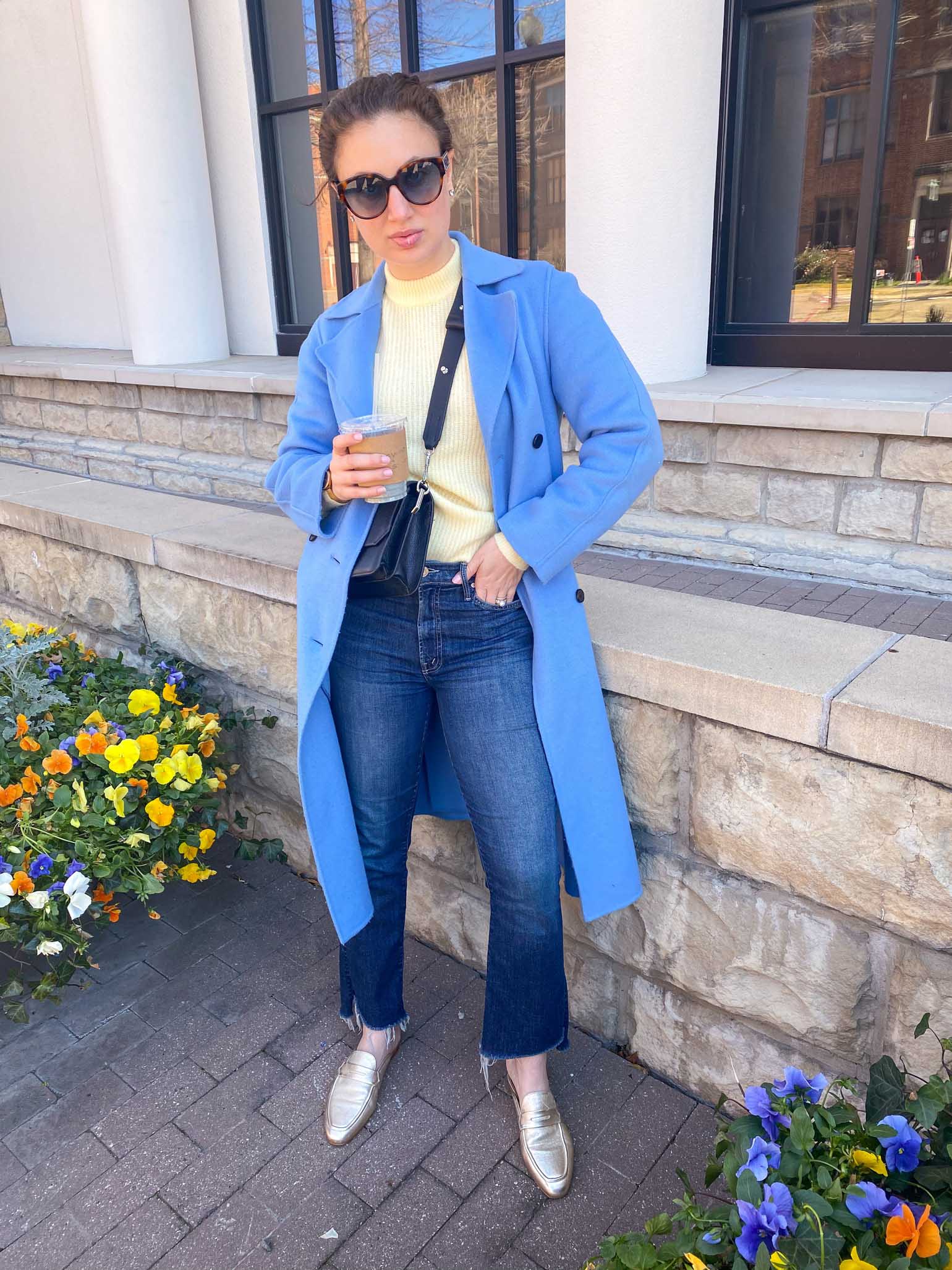 OUTFIT DETAILS: GANNI SWEATER (ALSO LOVE THIS ONE) | RAW HEM JEANS (AFFORDABLE OPTION) | LONG COAT (OLD, SIMILAR) | MINI HANDBAG | METALLIC MULES (OLD, SIMILAR) | TORTOISE SHELL SUNGLASSES