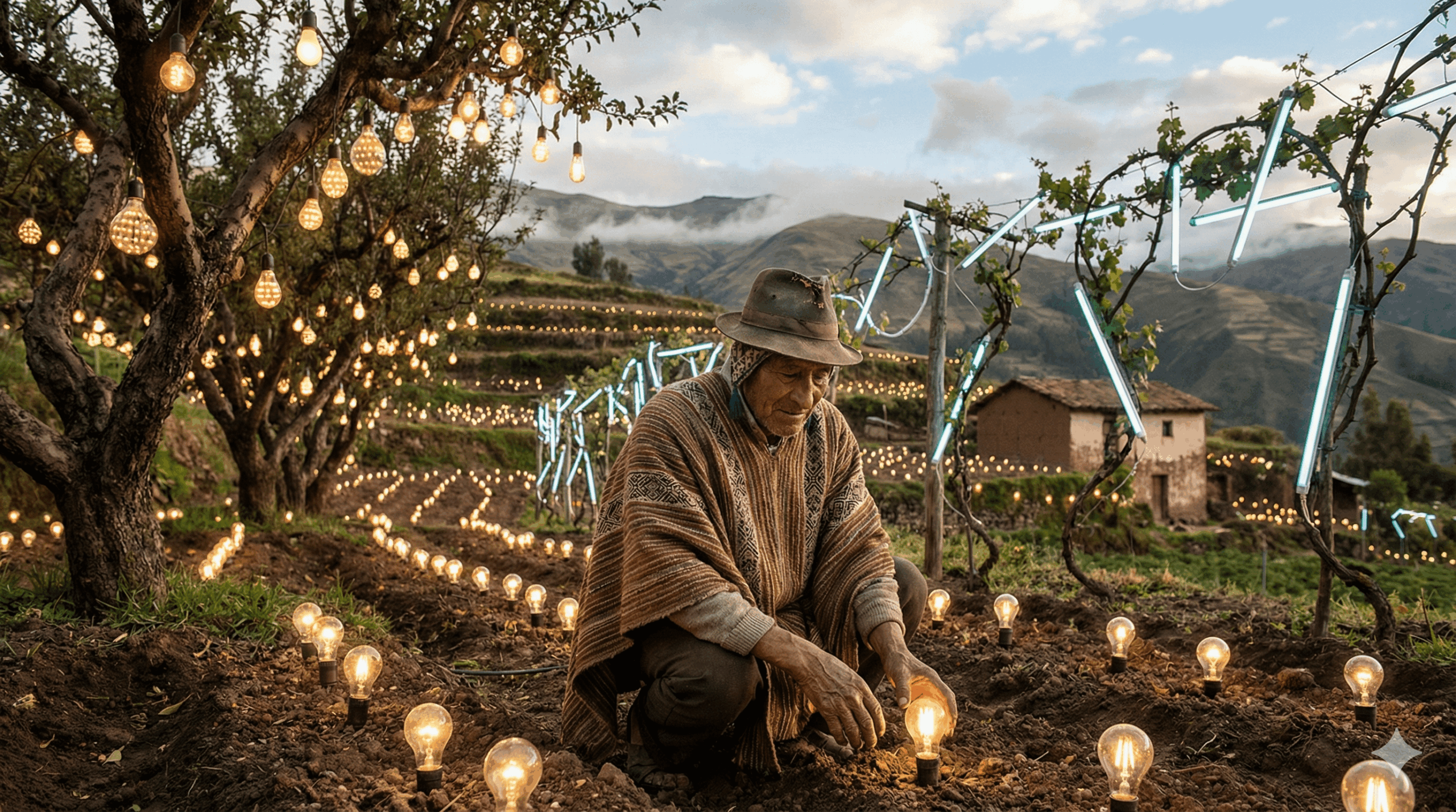 A photograph from National Geographic depicting an elderly farmer in Peru serenely tending to his fields, crops, and orchards. Everything being grown is a light producing object, such as incandescent bulbs in rows in the soil, fluorescent bulbs on vines, LEDs hanging like fruits from trees. A very detailed and picturesque photograph in late afternoon. Aside from the lights, everything is very natural and countryside-oriented with sloping hills in the background, way off to the horizon. None of the lights are gleaming bright; they are all glowing with a pleasant warm or cool low level light so as not to overpower the scene. This traditional Peruvian farm of many lights is a beautiful and charming scene, and the photograph is well-composed and captures all the details far and wide, worthy of winning awards the world over. It invites the viewer to notice so many details across the wide-angle shot.