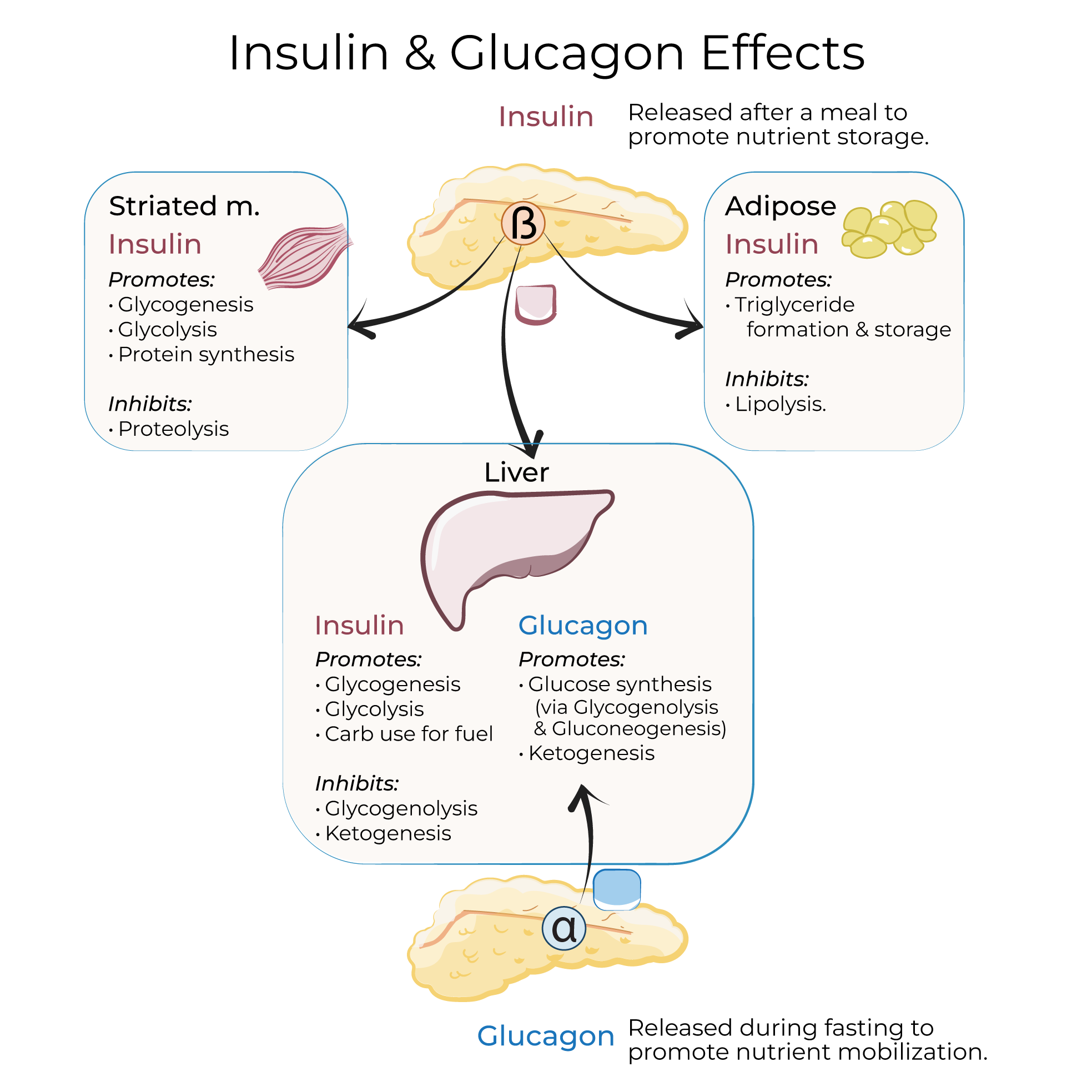 Insulin primarily acts on striated muscle, the liver, and adipose; glucagon primarily acts on the liver.