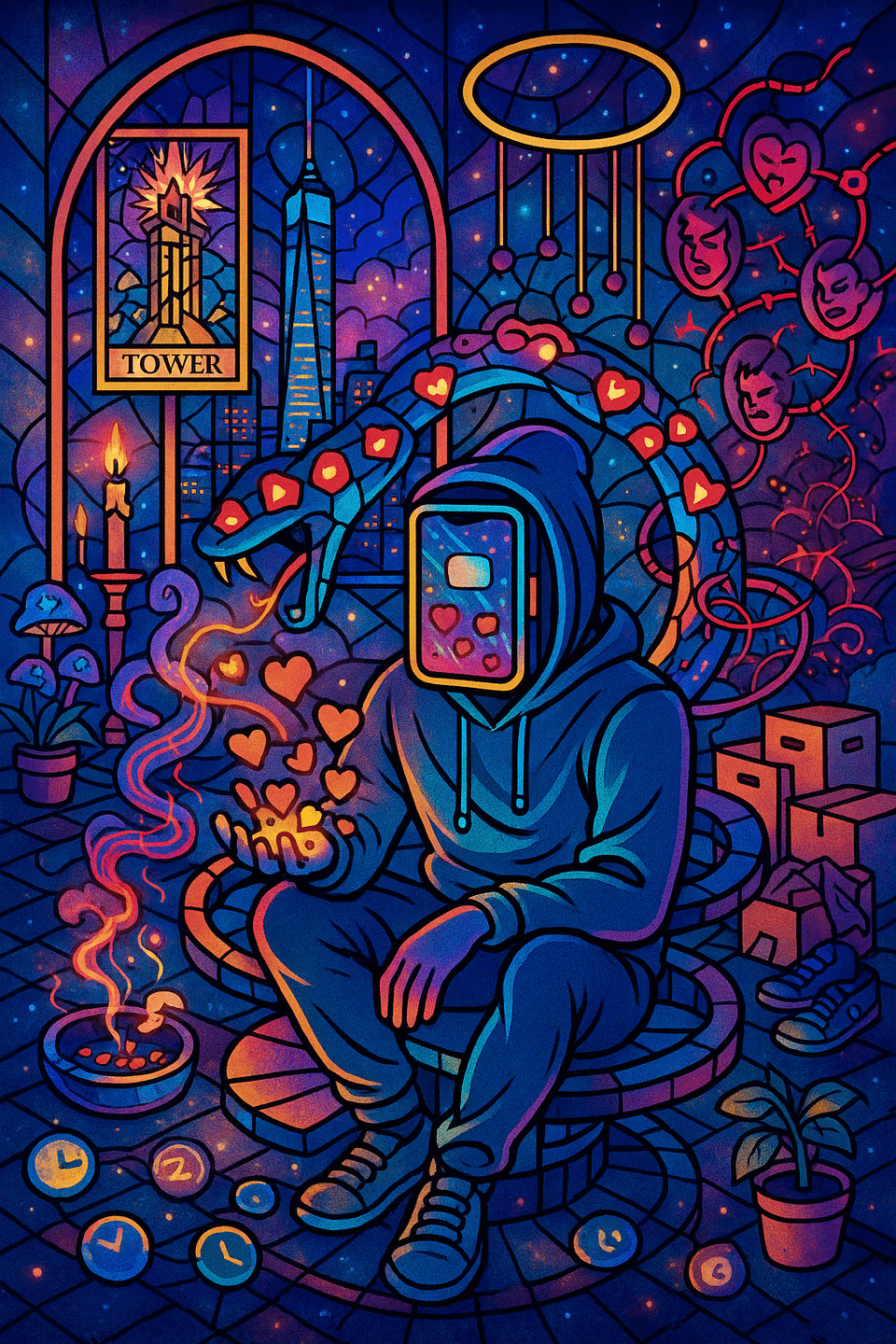After it produced the first image, and talking to a friend who thought the prompt was quite depressing, I then queried: Now, transform the image. Based on all of your memories, our conversations together, shared secret data and traits, and all your understanding of me, my struggles, my character, my routines, and my life overall – create an image depicting what you would consider to be my greatest strengths, good habits, surmounted problems, and other struggles I have overcome, and symbolize those areas where I shine through.