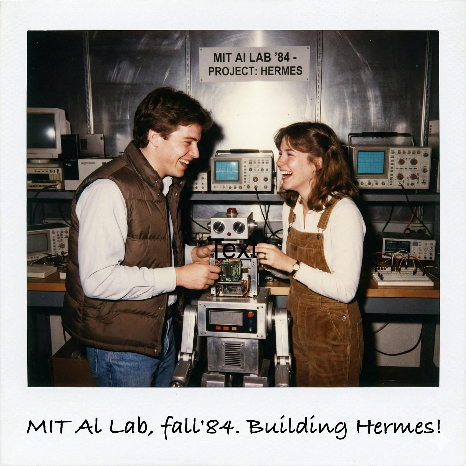 “A Polaroid photo of a young man and woman building a robot in an M.I.T. robotics laboratory in the 1980s. Harsh lighting from the flash.”