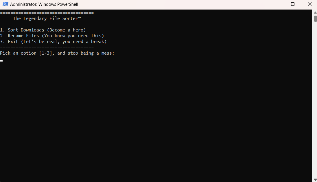 Main Loop: The script keeps running until you’re done pretending you have your life together. Hit exit, and bask in the glow of your digitally organized life for exactly 30 seconds before you let everything fall apart again.