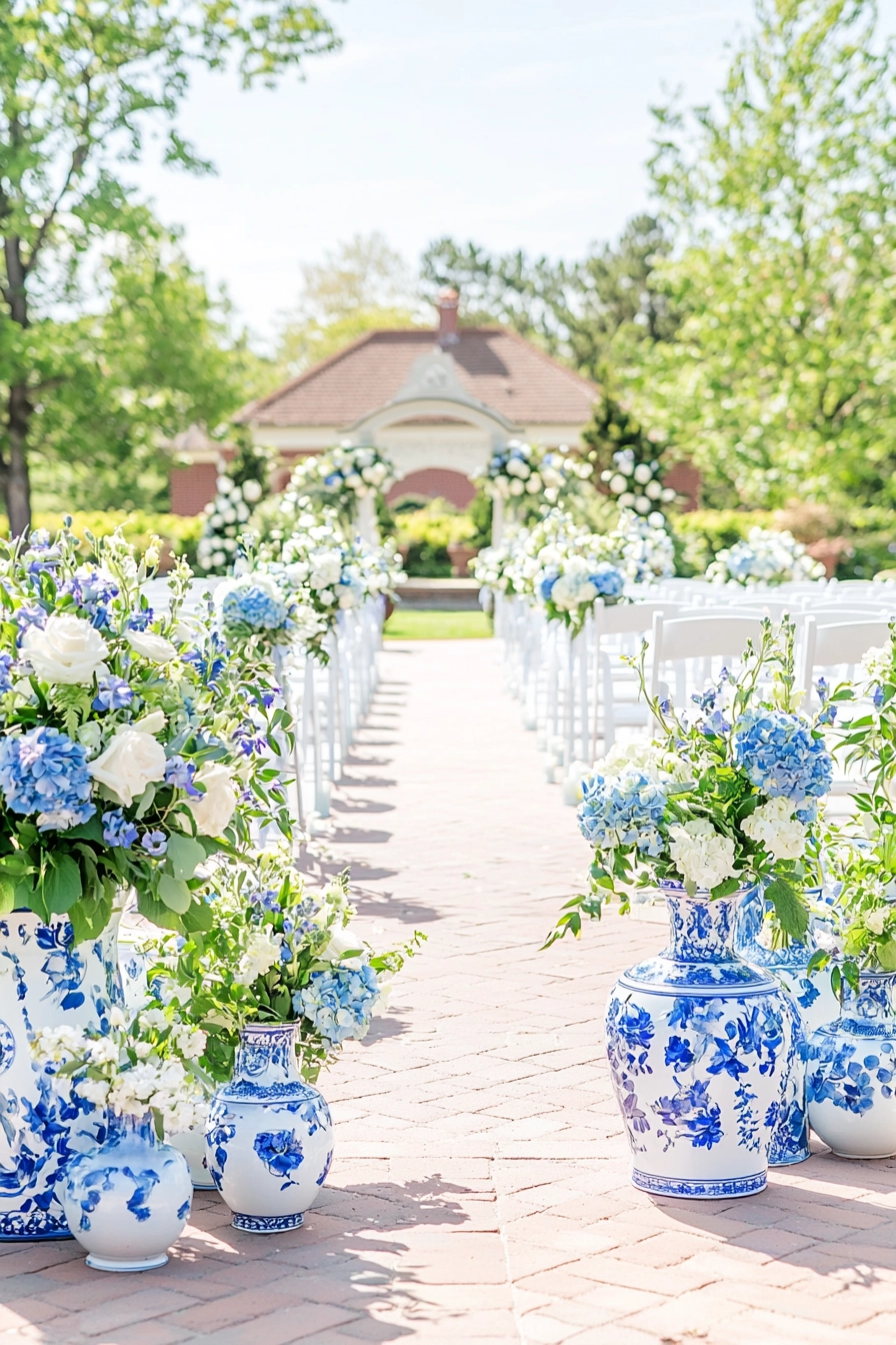 The ceremony is where the magic begins, so it’s essential to create a setting that captures your theme from the first moment. Picture a crisp white aisle runner framed by a collection of blue and white porcelain vases filled with hydrangeas, tulips, and soft greenery. These vases can also anchor a lush floral arch at the altar, providing a breathtaking focal point. For seating, opt for classic white chairs accented with navy ribbons or cushions for a cohesive look. The venue’s natural beauty—whether an outdoor garden or a light-filled chapel—completes the airy and elegant vibe.