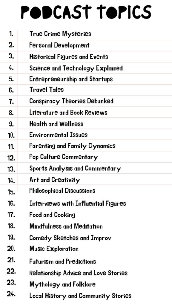 No more staring at a blank page wondering what to talk about – these lists are your trusty companions, ready to spark your creativity and keep your episodes flowing. With a range of topics, you can cater to different interests and bring in new listeners. It’s like opening your podcast doors to a bigger and more diverse crowd.
