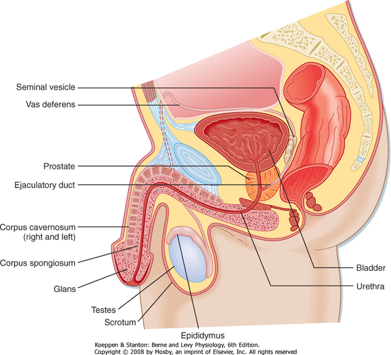 The male reproductive system has evolved for continuous, life-long gametogenesis, coupled with occasional internal insemination with a high density of sperm (>60 × 106/mL in 3 to 5 mL of semen). In adult men the basic roles of gonadal hormones are (1) support of gametogenesis (spermatogenesis), (2) maintenance of the male reproductive tract and production of semen, and (3) maintenance of secondary sex characteristics and libido. There is no overall cyclicity of this activity in men.