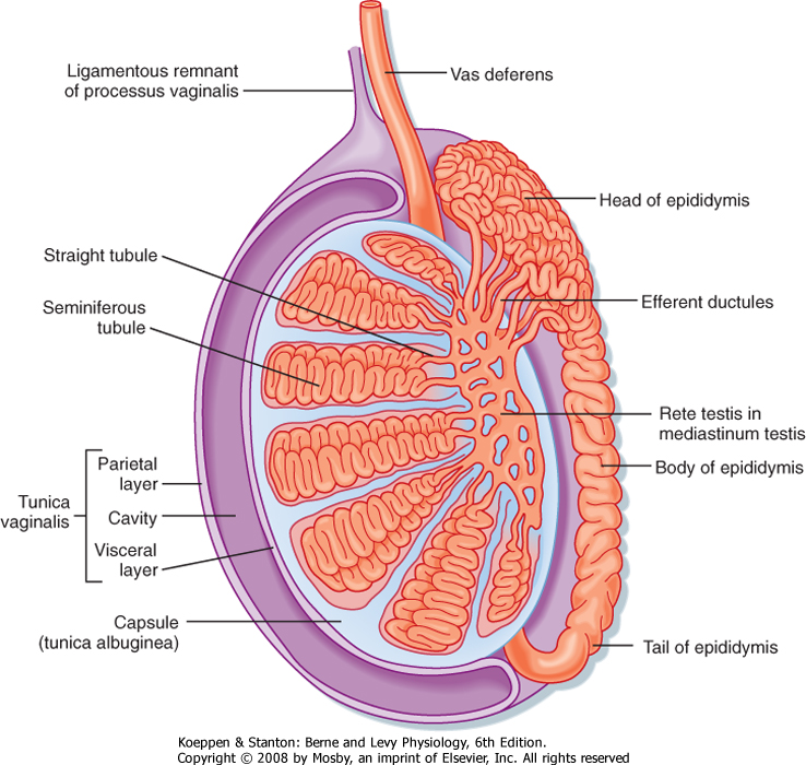 Unlike the ovaries, the testes reside outside the abdominal cavity in the scrotum (Fig. 43-1). This location maintains testicular temperature at about 2 degrees lower than body temperature, which is crucial for optimal sperm development. The human testis is covered by a connective tissue capsule and is divided into about 300 lobules by fibrous septa (Fig. 43-2). Within each lobule are two to four loops of seminiferous tubules. Each loop empties into an anastomosing network of tubules called the rete testis. The rete testis is continuous with small ducts, the efferent ductules, that lead the sperm out of the testis into the head of the epididymis on the superior pole of the testis (Fig. 43-2). Once in the epididymis, the sperm pass from the head, to the body, to the tail of the epididymis and then to the vas (ductus) deferens. Viable sperm can be stored in the tail of the epididymis and the vas deferens for several months.