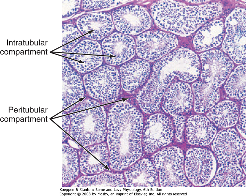 The presence of the seminiferous tubules creates two compartments within each lobule: an intratubular compartment, which is composed of the seminiferous epithelium of the seminiferous tubule, and a peritubular compartment, which is composed of neurovascular elements, connective tissue cells, immune cells, and the “interstitial cells of Leydig,” whose main function is to produce testosterone (Fig. 43-3).