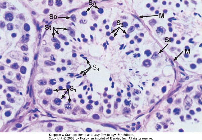 Figure 43-4 Histology of a seminiferous tubule. M, myoid cell just outside the basal lamina; S1, primary spermatocyte; S3, spermatid; S4, mature spermatid or spermatozoon; SB and SA, spermatogonia; St, Sertoli cell. (From Young B et al: Wheater’s Functional Histology. A Text and Colour Atlas, 5th ed. London, Churchill Livingstone, 2006.)