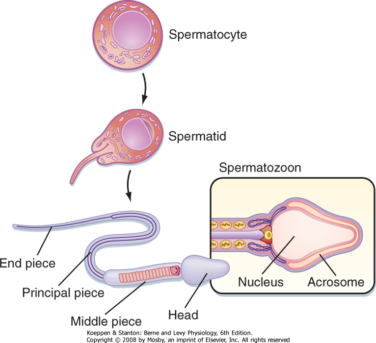 Figure 43-5 Structure of sperm cells during the process of spermatogenesis and spermiogenesis.