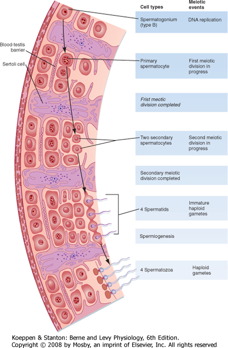 Spermatozoa (Fig. 43-4) are found at the luminal surface of the seminiferous tubule. Release of sperm, or spermiation, is controlled by Sertoli cells. The process of spermatogenesis takes about 72 days. A cohort of adjacent spermatogonia enter the process every 16 days so that the process is staggered at one point along a seminiferous tubule. In addition, the process is staggered along the length of a seminiferous tubule (i.e., not all spermatogonia enter the process of spermatogenesis at the same time along the entire length of the tubule or in synchrony with every other tubule; there are about 500 seminiferous tubules per testis; see later). Because the seminiferous tubules within one testis are about 400 m in length, spermatozoa are continually being generated at many sites within the testis at any given time.