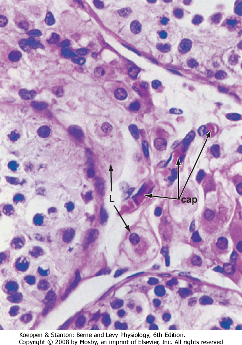 Figure 43-7 Histology of the peritubular space containing Leydig cells (L) and richly vascularized by peritubular capillaries (cap). (Modified from Young B et al: Wheater’s Functional Histology. A Text and Colour Atlas, 5th ed. London, Churchill Livingstone, 2006.)