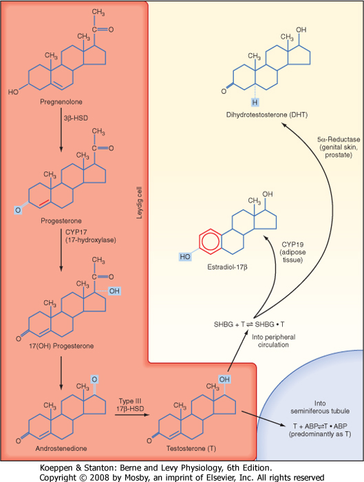 Figure 43-8 Steroidogenic pathway in Leydig cells (the first step of converting cholesterol to pregnenolone is omitted). Testosterone is sequestered by binding to androgen-binding protein (ABP) within the seminiferous tubules or circulates within the peripheral circulation bound to sex hormone-binding globulin (SHBG) and can be peripherally converted to dihydrotestosterone or estradiol-17β. (Modified from Porterfield SP, White BA: Endocrine Physiology, 3rd ed. Philadelphia, Mosby, 2007.)