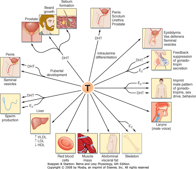 10. Testosterone, DHT, and estradiol have numerous actions on the male reproductive tract, external genitalia, and male secondary sex characteristics, as well as on other organ systems (e.g., blood cell production, lipoprotein production, bone maturation).