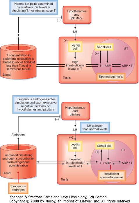 There is an important “loophole” in the male reproductive axis that is based on the fact that intratesticular levels of testosterone need to be greater than 100-fold higher than circulating levels of the hormone to maintain normal rates of spermatogenesis; however, it is the circulating levels of testosterone that provide the negative feedback to the pituitary and hypothalamus. This means that exogenous administration of testosterone can raise circulating levels sufficient to inhibit LH but not sufficient to accumulate in the testis at the required concentration for normal spermatogenesis. However, the decreased LH levels will diminish intratesticular production of testosterone by Leydig cells, which results in reduced levels of spermatogenesis (Fig. 43-11). This “loophole” is currently being investigated as a possible strategy for developing a male oral contraceptive. It is also the basis for sterility in some cases of steroid abuse in men.