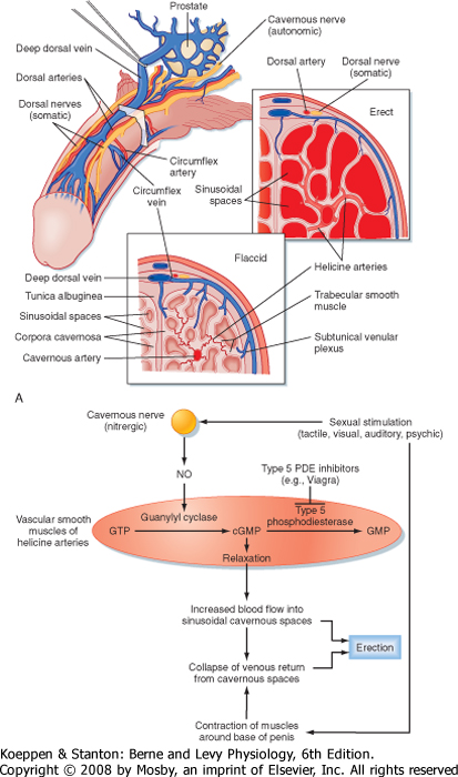 response to sexual arousal, the parasympathetic cavernous nerves innervating the vascular smooth muscle of the helicine arteries release nitric oxide (NO). NO activates guanylyl cyclase, thereby increasing cGMP, which decreases intracellular [Ca++] and causes muscular relaxation (Fig. 43-12, B). The vasodilation allows blood to flow into the cavernous spaces to induce engorgement and erection. It also presses on veins in the penis and reduces venous drainage (Fig. 43-12, B).