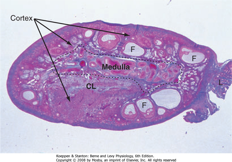 The ovary is divided into an outer cortex and inner medulla (Fig. 43-14). Neurovascular elements innervate the medulla of the ovary. The cortex of the ovary is composed of a densely cellular stroma. Within this stroma reside the ovarian follicles (Fig. 43-14), which