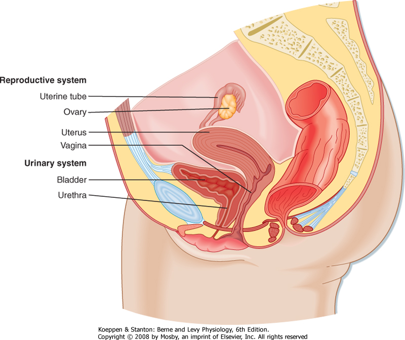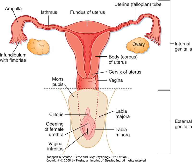 Figure 43-13 Anatomy of the female reproductive system. (Modified from Drake RL et al: Gray’s Anatomy for Students. Philadelphia, Churchill Livingstone, 2005.)
