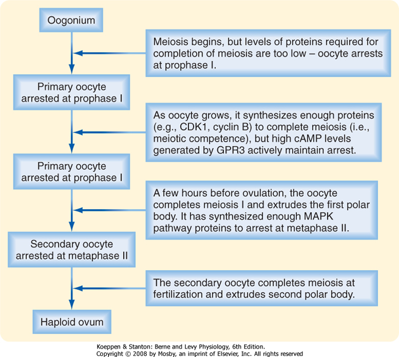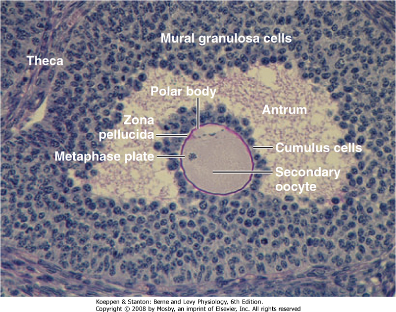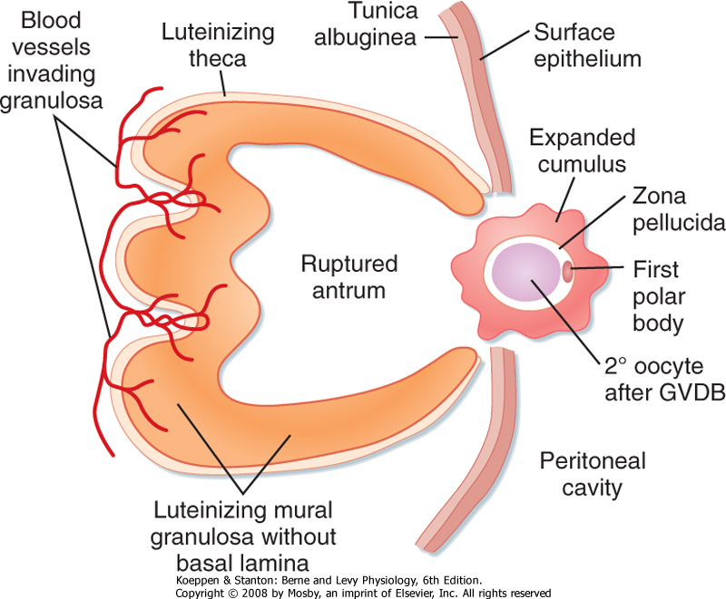 18. High levels of estradiol occur around midcycle and exert positive feedback on gonadotropin secretion. This induces the LH (and a smaller FSH) surge. The midcycle gonadotropin surge induces (a) meiotic maturation of the primary oocyte so that it progresses to a secondary oocyte (with one polar body) arrested at metaphase of the second meiotic division, (b) breakdown of the ovarian and follicular wall so that the oocyte-cumulus complex is extruded (called ovulation), and (c) differentiation of the remaining follicular cells into a corpus luteum. The corpus luteum produces high levels of progesterone, estradiol, and inhibin.