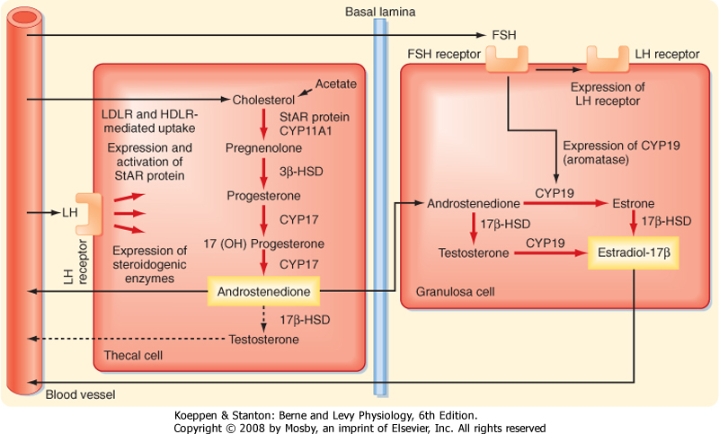 Leydig cells are steroidogenic stromal cells. These cells synthesize cholesterol de novo, as well as acquire it through low-density lipoprotein (LDL) receptors and high-density lipoprotein (HDL) receptors (also called scavenger receptor BI [SR-BI]), and store cholesterol as cholesterol esters, as described for adrenocortical cells (see Chapter 42). Free cholesterol is generated by a cholesterol ester hydrolase and transferred to the outer mitochondrial membrane and then to the inner mitochondrial membrane in a steroidogenic acute regulatory (StAR) protein-dependent manner. As in all steroidogenic cells, cholesterol is converted to pregnenolone by CYP11A1. Pregnenolone is then processed to progesterone, 17-hydroxyprogesterone, and androstenedione by 3β-hydroxysteroid dehydrogenase (3β-HSD) and CYP17 (Fig. 43-8). Recall from Chapter 42 that CYP17 is a bifunctional enzyme with 17-hydroxylase activity and 17,20-lyase activity. CYP17 displays a robust level of both activities in the Leydig cell. In