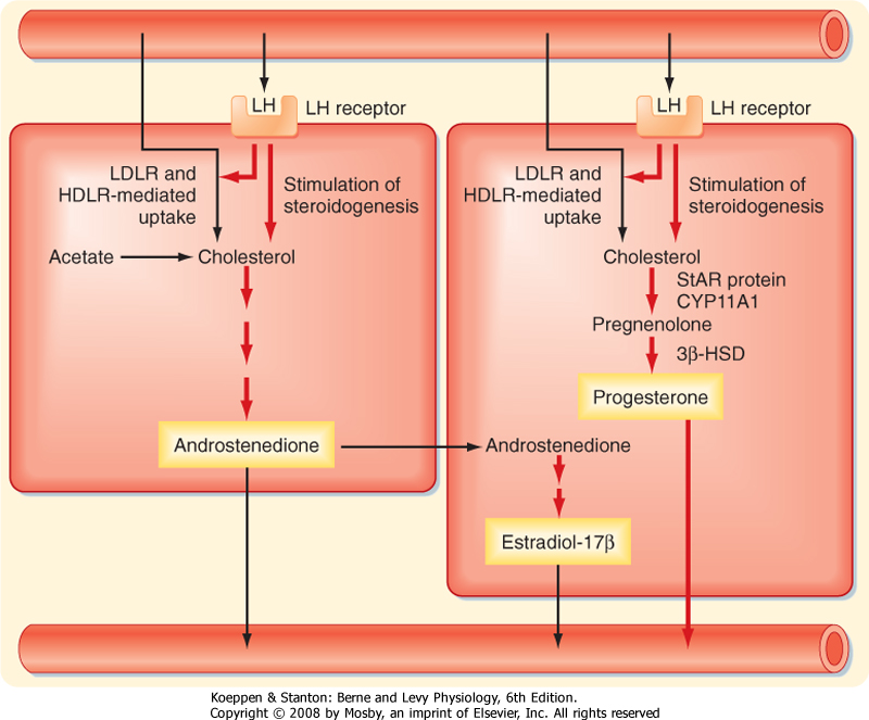 The Leydig cell expresses the LH receptor, which acts on Leydig cells much like adrenocorticotropic hormone (ACTH) does on zona fasciculata cells in the adrenal cortex (see Chapter 42). Rapid effects include hydrolysis of cholesterol esters and new expression of StAR protein. Less acute effects include an increase in steroidogenic enzyme gene expression and expression of the LDL receptor and SR-BI (the HDL receptor). Over the long term, LH promotes Leydig cell growth and proliferation.