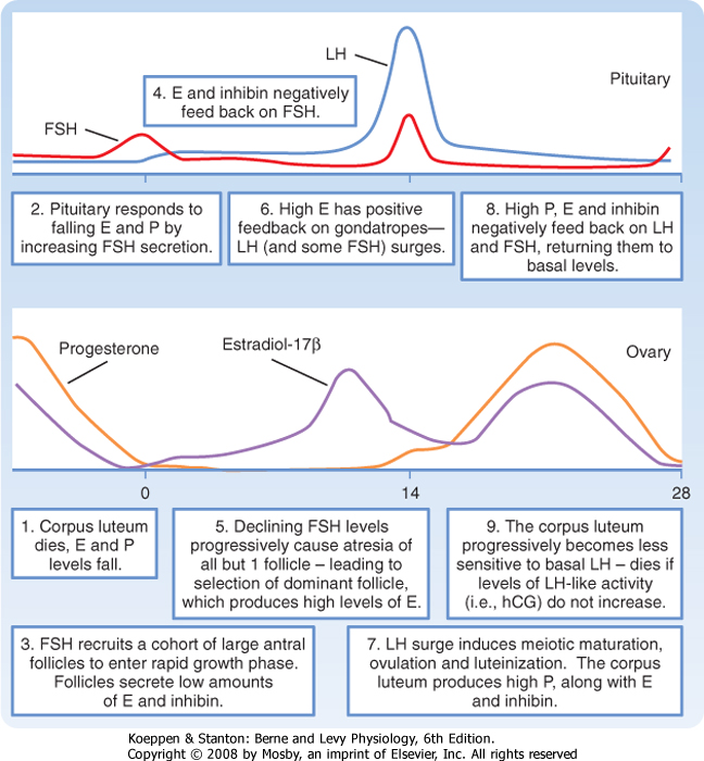 understood. Age-related changes in the CNS, including critical patterns of GnRH secretion, precede follicular depletion and may play an important role in menopause. Because follicles do not develop in response to LH and FSH secretion, estrogen and progesterone levels drop. Loss of the negative-feedback inhibition of estrogen on GnRH and LH/FSH results in a marked rise in serum LH and FSH. FSH levels rise more than LH levels. This could result from loss of ovarian inhibin.