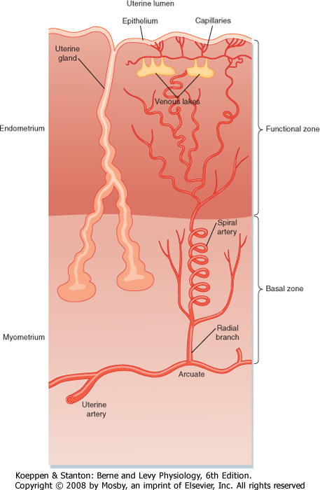 21. The uterine mucosa, called the endometrium, is the normal site of embryonic implantation. The mucosa is increased in thickness in preparation for implantation and is sloughed away if no pregnancy occurs.