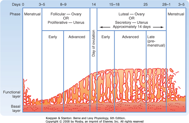 16. The follicular phase of the ovary corresponds to the menstrual and proliferative phases of the uterine endometrium. The luteal phase of the ovary corresponds to the secretory phase of the uterine endometrium.