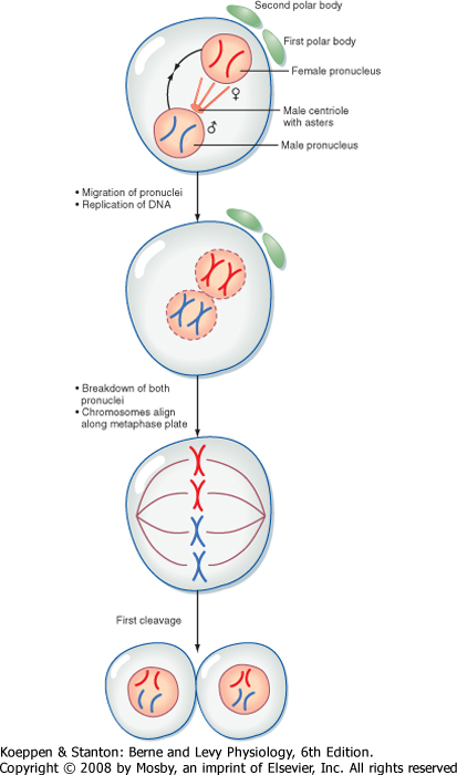 Spermatogenesis involves the processes of mitosis and meiosis. Stem cells, called spermatogonia, reside at the basal level of the seminiferous epithelium (Fig. 43-4). Spermatogonia divide mitotically to generate daughter spermatogonia (spermatocytogenesis). One or more spermatogonia remain within the stem cell population, firmly adherent to the basal lamina. However, the majority of these daughter spermatogonia enter meiotic division, which results in haploid spermatozoa on completion of meiosis. These divisions are accompanied by incomplete cytokinesis such that all daughter cells remain interconnected by a cytoplasmic bridge. This configuration contributes to the synchrony of development of a clonal population of sperm cells. Spermatogonia migrate apically away from the basal lamina as they enter the first meiotic prophase. At this time they are called primary spermatocytes (Fig 43-4). During the first meiotic prophase, the hallmark processes of sexual reproduction involving chromosomal reduplication, synapsis, crossing over, and homologous recombination take place. Completion of the first meiotic division gives rise to secondary spermatocytes, which quickly (i.e., within