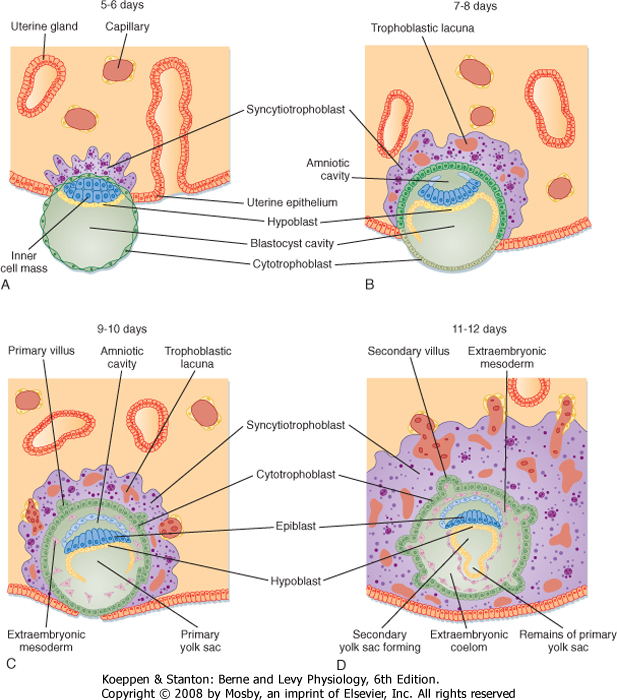 As implantation and placentation progress, syncytiotrophoblasts take on the important functions of phagocytosis (during histiotropic nutrition) and bidirectional placental transfer of gases, nutrients, and wastes. Exchange across the syncytiotrophoblasts