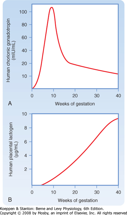 Figure 43-34 Circulating levels of human chorionic gonadotropin and human placental lactogen in maternal blood during pregnancy. (Modified from Porterfield SP, White BA: Endocrine Physiology, 3rd ed. Philadelphia, Mosby, 2007.)