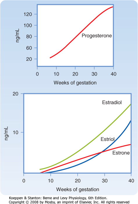 Figure 43-36 Maternal serum levels of progesterone and estrogens during pregnancy. (Modified from Porterfield SP, White BA: Endocrine Physiology, 3rd ed. Philadelphia, Mosby, 2007.)