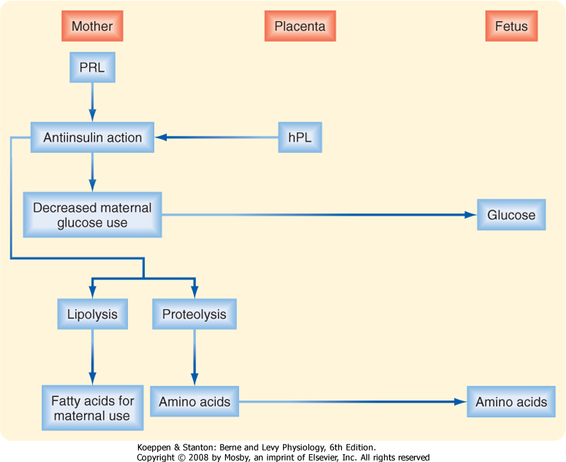Like GH, hPL is protein anabolic and lipolytic. Its antagonistic action to insulin is the major basis for the diabetogenicity of pregnancy. Like PRL, it stimulates mammary gland growth and development. Mammary gland development in pregnancy results from the actions of hPL, PRL, estrogens, and progestins. hPL inhibits maternal glucose uptake and use, thereby increasing serum glucose levels. Glucose is a major energy substrate for the fetus, and hPL increases fetal glucose availability.