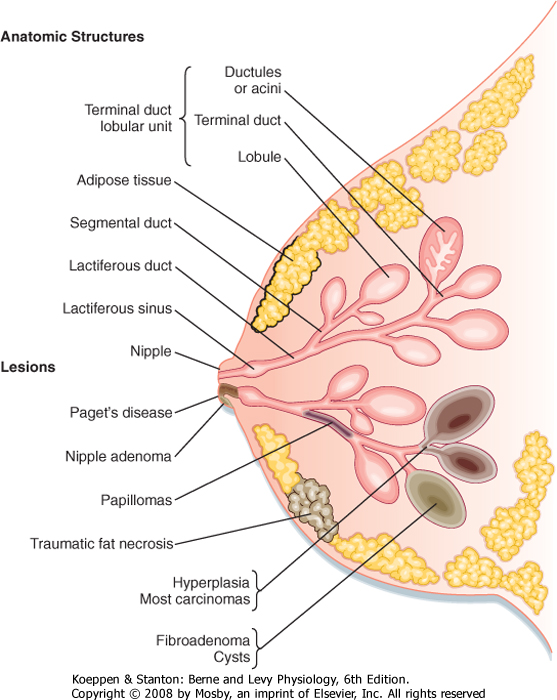 Figure 43-38 Diagram of the structure of the breast, along with some pathological conditions of the breast and where they occur. (From Crum CP et al. In Kumar V et al [eds]: Robbins Basic Pathology, 7th ed. Philadelphia, Saunders, 2003.)