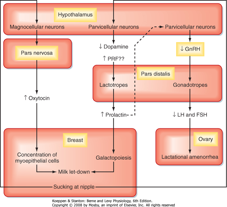 progesterone, normal breast milk production occurs within a few days. The lobuloalveolar structures produce milk, which is subsequently modified by the ductal epithelium. Lactogenesis and maintenance of milk production (galactopoiesis) require stimulation by pituitary PRL in the presence of normal levels of other hormones, including insulin, cortisol, and thyroid hormone. Although placental estrogen stimulates PRL secretion during pregnancy, the stimulus for PRL secretion during the nursing period is suckling by the infant (Fig. 43-39). Levels of PRL are directly correlated with the frequency and duration of suckling at the nipple. The link between suckling at the nipple and PRL secretion involves a neuroendocrine reflex in which dopamine secretion at the median eminence is inhibited (the PRL release inhibitory factor; see Chapter 40). It is also possible that suckling increases the secretion of unidentified PRL-releasing hormones.
