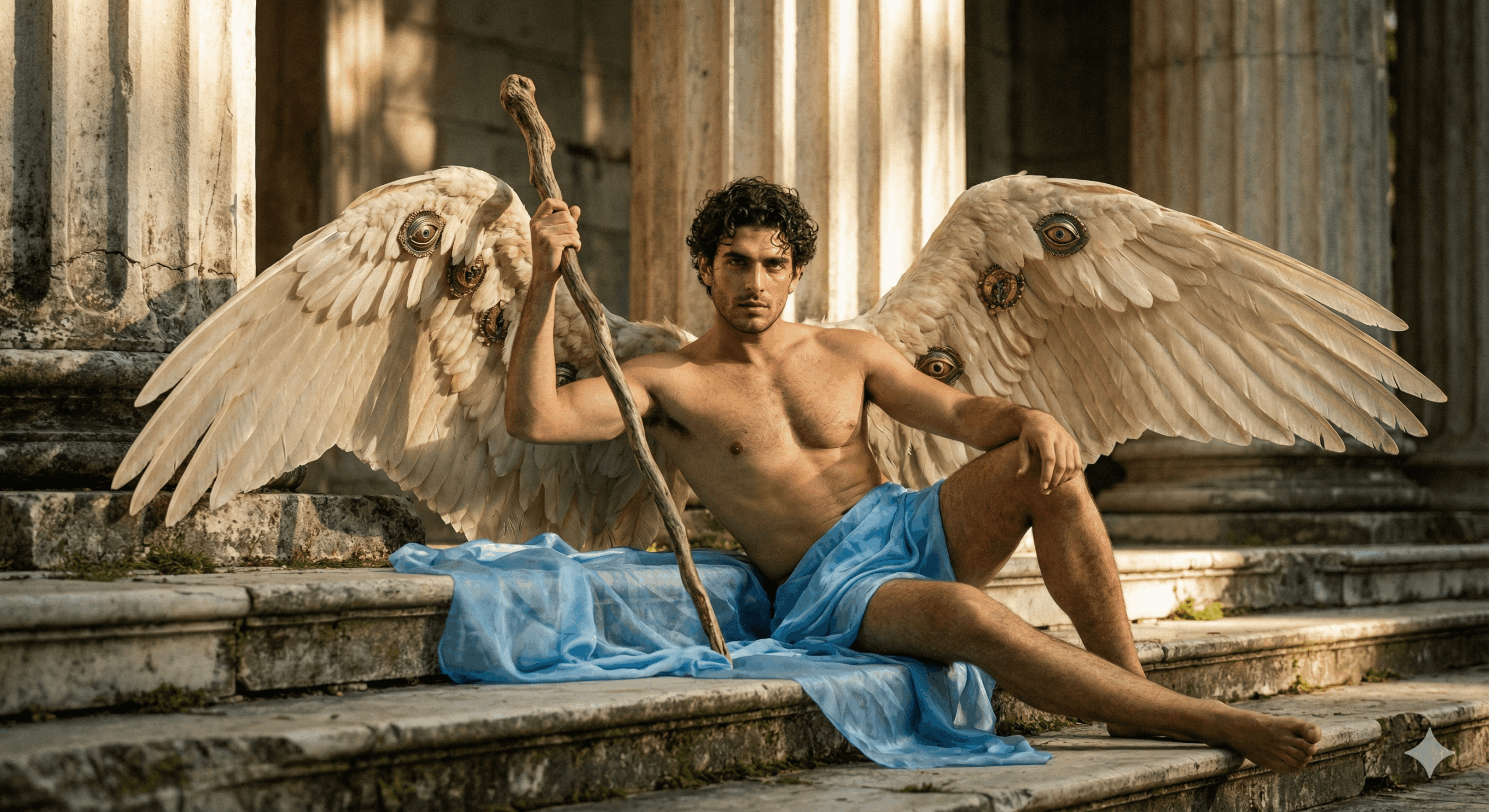 shot on location at ancient ruins, Greek temple setting, outdoor natural light, atmospheric perspective, depth of field, bokeh background, sharp focus on subject, professional color grading, cinematic color palette, warm stone tones, cool shadows, desaturated aesthetic, museum quality fine art photography,