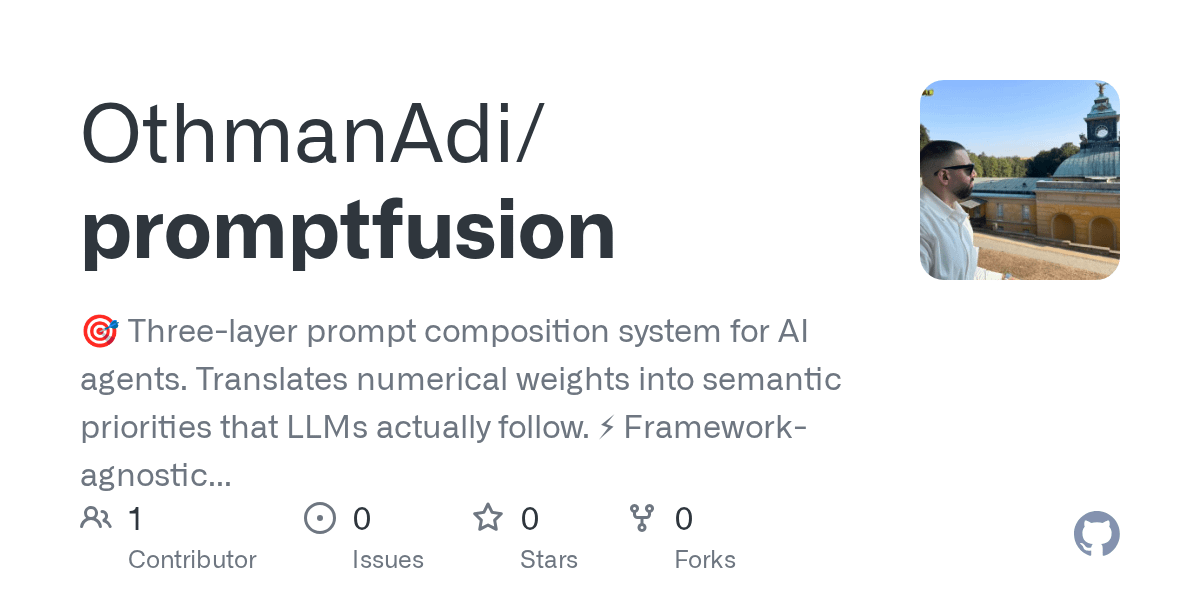OthmanAdi/promptfusion: 🎯 Three-layer prompt composition system for AI agents. Translates numerical weights into semantic priorities that LLMs actually follow. ⚡ Framework-agnostic, open source, built for production multi-agent orchestration.