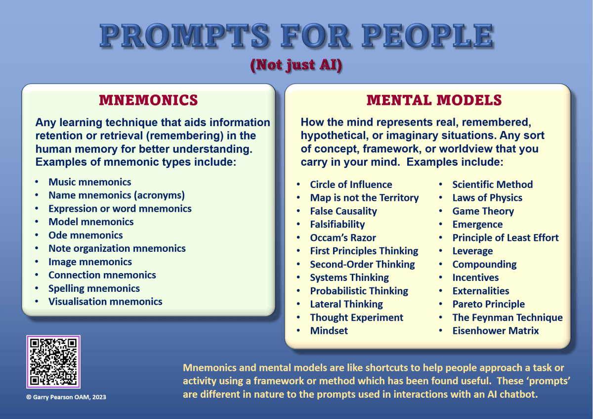 The notion of prompt ‘engineering’ is not new of course. Neither is the use of a class of algorithms called ‘mental models’, which can help with decision-making, information processing, and problem-solving. Likewise, mnemonics help people to remember certain patterns, or offer template outlines (i.e. prompts) of the parts of a system or process. Some of these have been used for generations. Both AI and People prompts are addressed in this post.