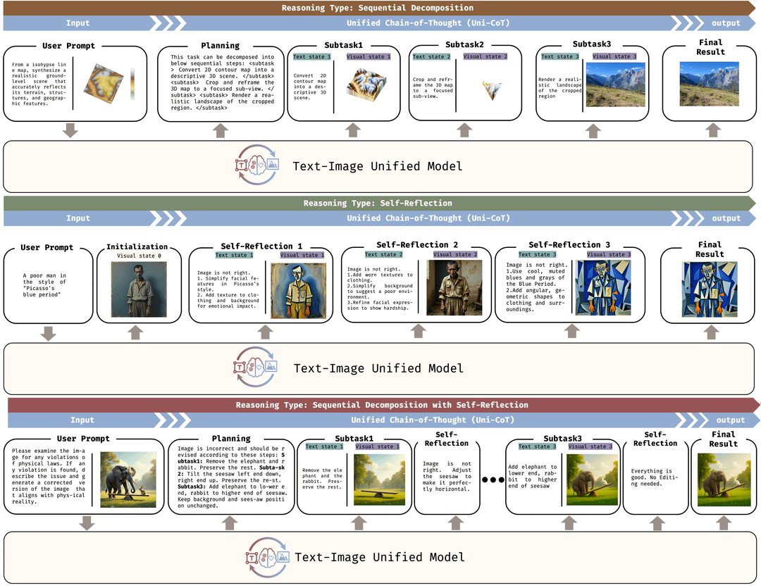 Specifically, we use one unified architecture (inspired by Bagel/Omni/Janus) to support multi-modal reasoning. This minimizes discrepancy between reasoning trajectories and visual state transitions, enabling coherent cross-modal reasoning. However, the multi-modal reasoning with unified model raise a large burden on computation and model training.