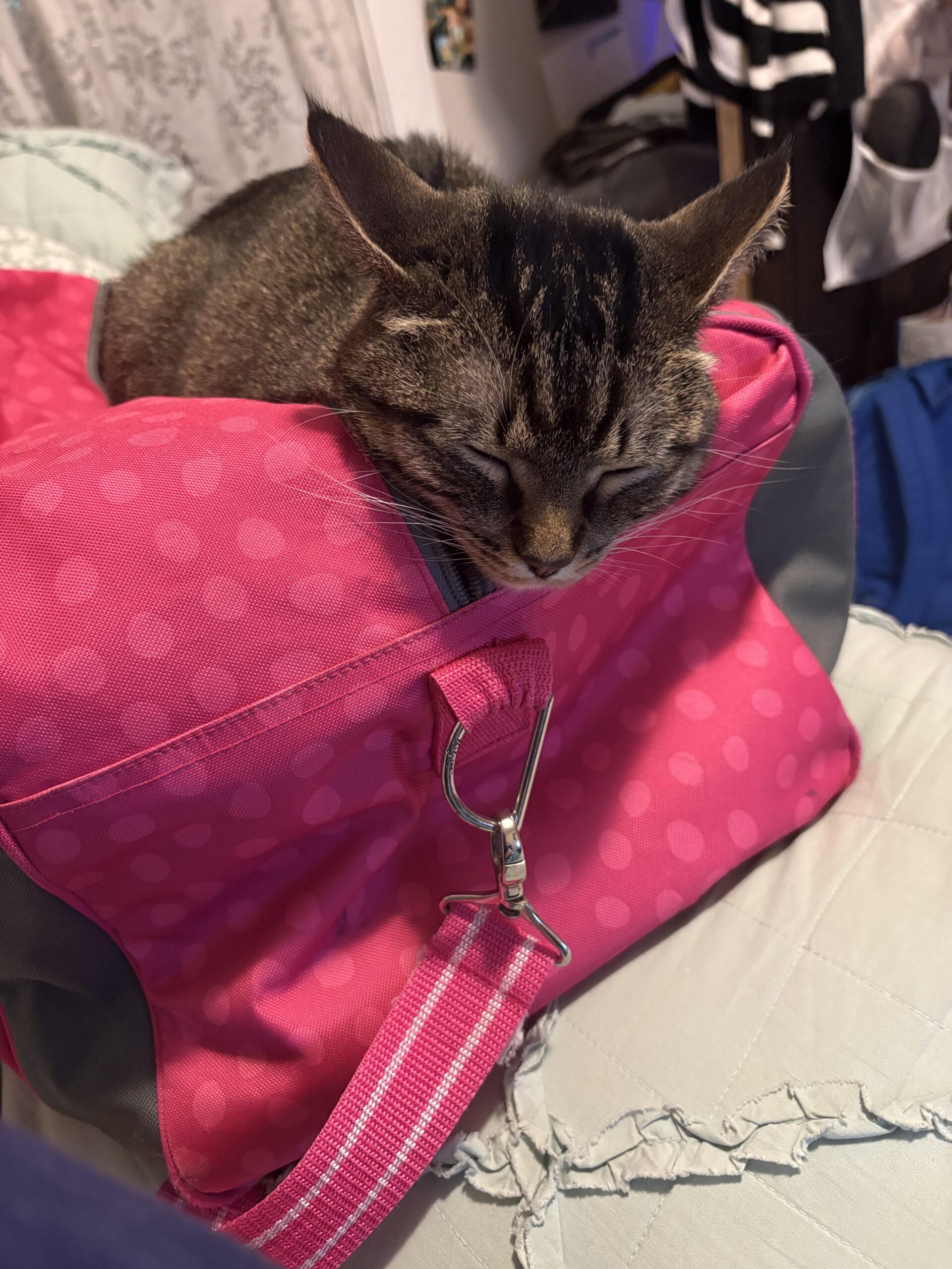 Rachel sees my overnight bag and throws herself in it so I won’t leave (but don’t worry, she gets put in her carrier and rides with me in the front seat 😁)